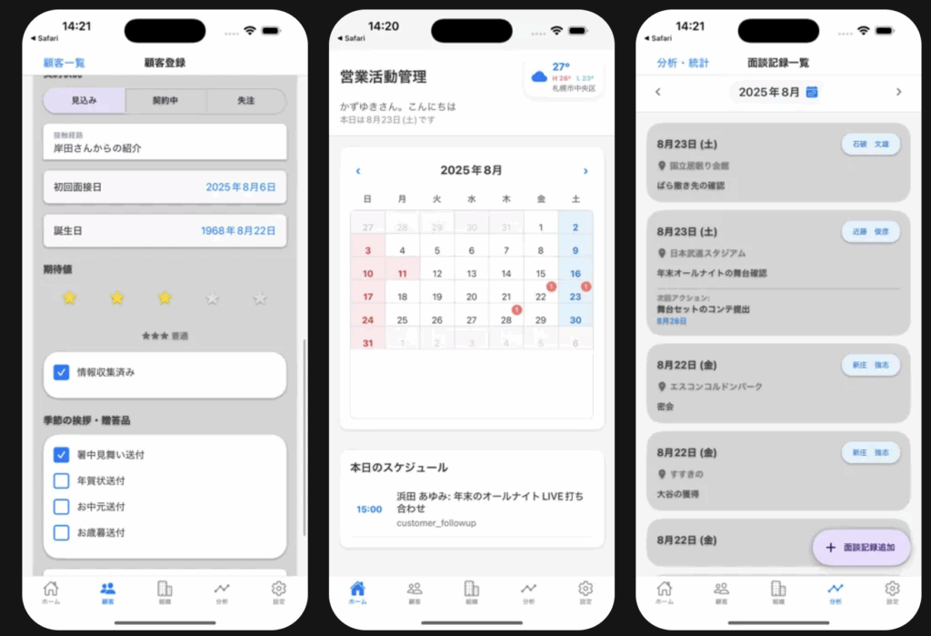 スケジュールの中に顧客が存在する仕組みから顧客を中心に過去の履歴・顧客別のスケジュールが確認できるように顧客を中心としたスケジュールとタスクの管理もできるCRMアプリになっています。 Googleカレンダー連携で読み込み・書き込みが可能で読み込みしたデーターを顧客との履歴やアポイントメントスケジュールに反映可能です。